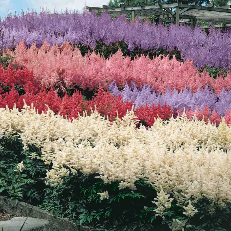 Tall, feathery plumes of white, pink, lavender and red flowers are held high above dark green, fernlike foliage. A vivid partner to other shade-loving perennials such as hostas and ferns. Makes big, frothy bouquets. Varieties are not individually labeled.