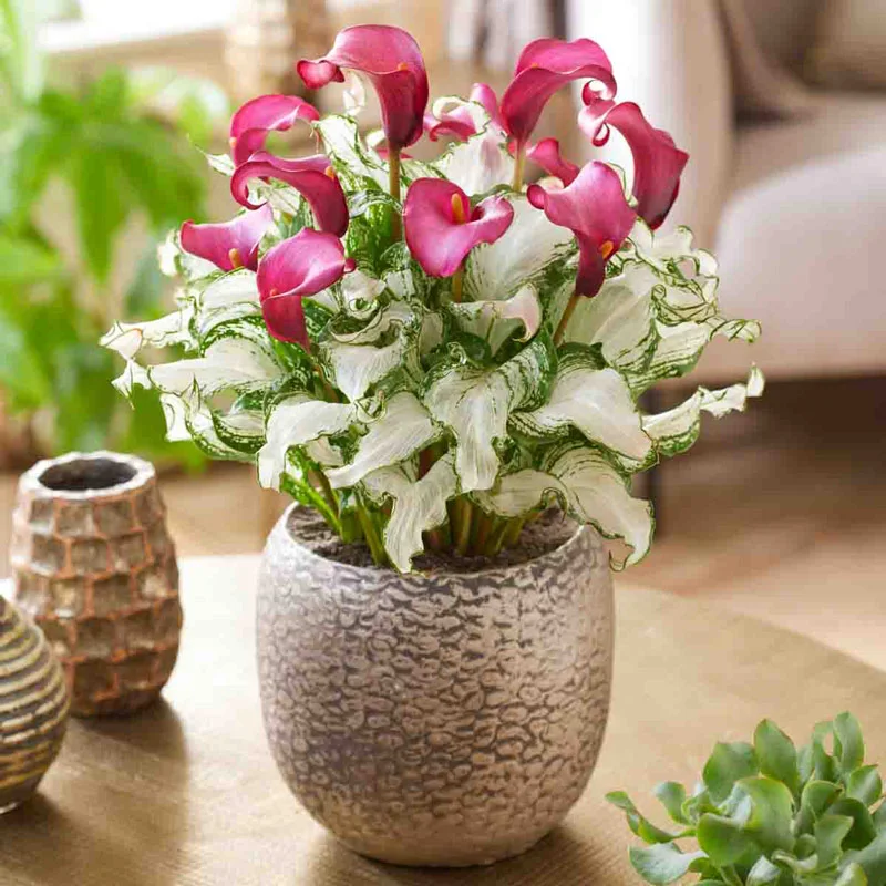 We're thrilled to be the exclusive seller in the U.S. and Canada of this transcendent calla lily! Frozen Queen will enchant you even before its wine-red blooms begin opening. The unique hues and shapes of the variegated foliage are, in a word, breathtaking. Translucent, silvery-white leaves irregularly outlined in green brush strokes elegantly twist and curve as they climb skyward. The upright, trumpet-shaped flowers, which are 10 cm in length and 5–7 cm in diameter, arrive in midsummer displaying the colour of a good Bordeaux to add gorgeous contrast. This versatile beauty is equally at home outside in the garden and indoors as a houseplant. Outdoors, it deserves a spot in the front row where it can be admired, such as in a border or patio pot. In areas with hot, humid summers, we recommend planting this calla lily where it will get at least some shade and avoid being in direct sunlight during the hottest hours of the day. Don’t pass this one by!