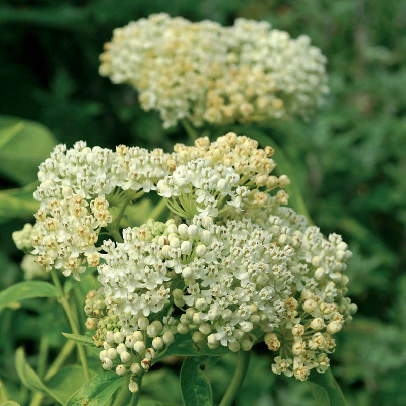 Attract butterflies and hummingbirds with this mildly fragrant sun lover. Toward summer's end, small white flowers appear in clusters atop 90 cm stems. Blooms are followed by attractive, 10 cm long seedpods that split open when ripe and release silvery-haired seeds.
